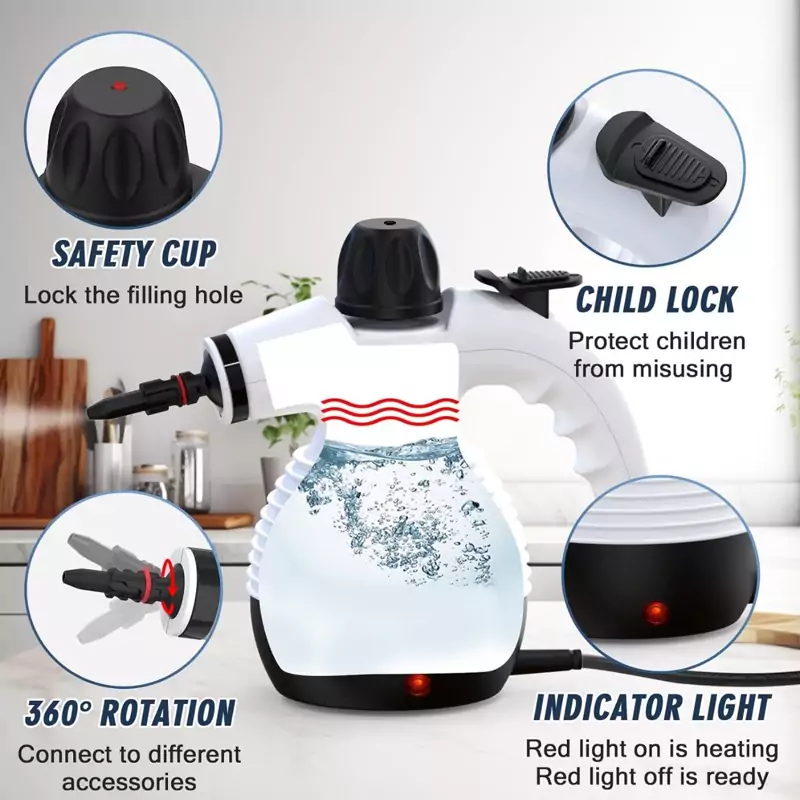 بخار بخار قدرتمند: تمیز کردن بخارپز به سرعت در 3 دقیقه گرم می شود و بخار داغ قدرتمند با فشار 221 درجه فارنهایت منتشر می کند. توان 1050 وات، ظرفیت مخزن آب 350 میلی لیتر (ظرفیت آب 250 میلی لیتر توصیه می شود تا مقداری فضا برای استفاده معمولی باقی بماند)، زمان کار مداوم 10 دقیقه یا بیشتر.