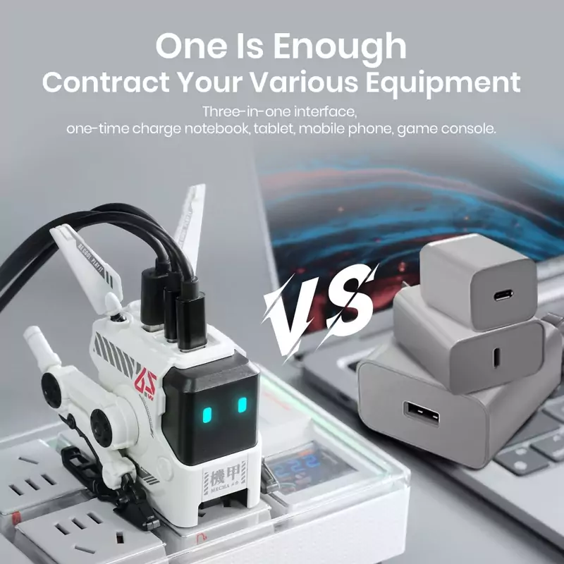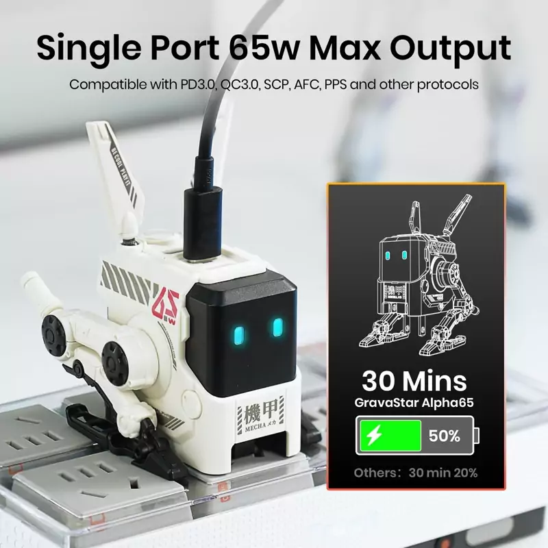 طراحی ربات Mecha، شارژ را سرگرم کننده تر می کند: شارژر سریع آلفا 65 واتی USB C فقط یک دستگاه شارژ نیست، بلکه قطعه ای است که حال و هوای آینده نگرانه را به فضای شما می بخشد. با ویژگی منحصربهفرد تغییر شکل، میتواند برای شارژ بنشیند یا برای نمایش بایستد. این نه تنها یک شارژر، بلکه یک ابزار فن آوری جالب است.