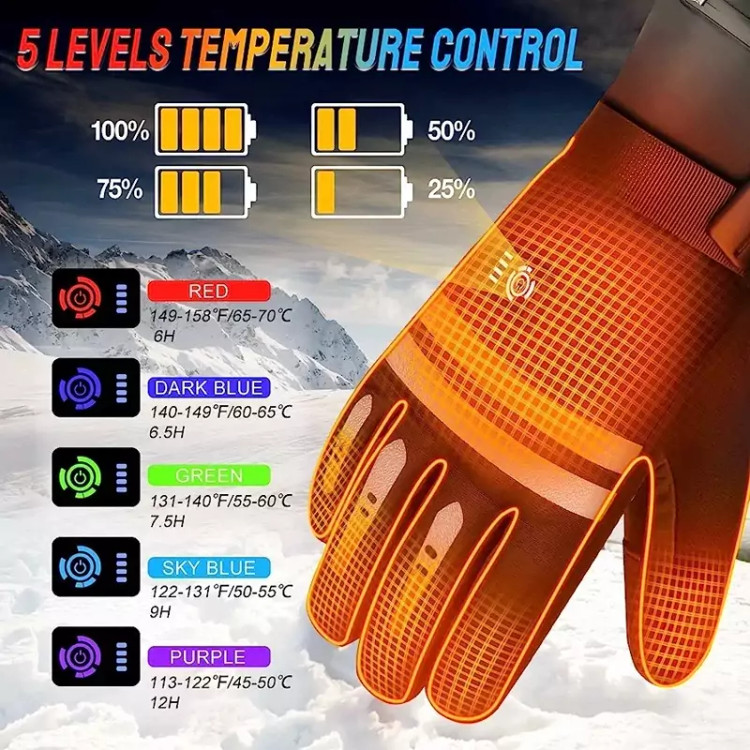 این دستکشها دارای یک سیستم گرمایشی با باتری 7.4 ولتی 5000 میلیآمپر ساعتی هستند که به صورت ارگونومیک در پشت دست قرار گرفته و پنج انگشت به نوک انگشتان میرسد.