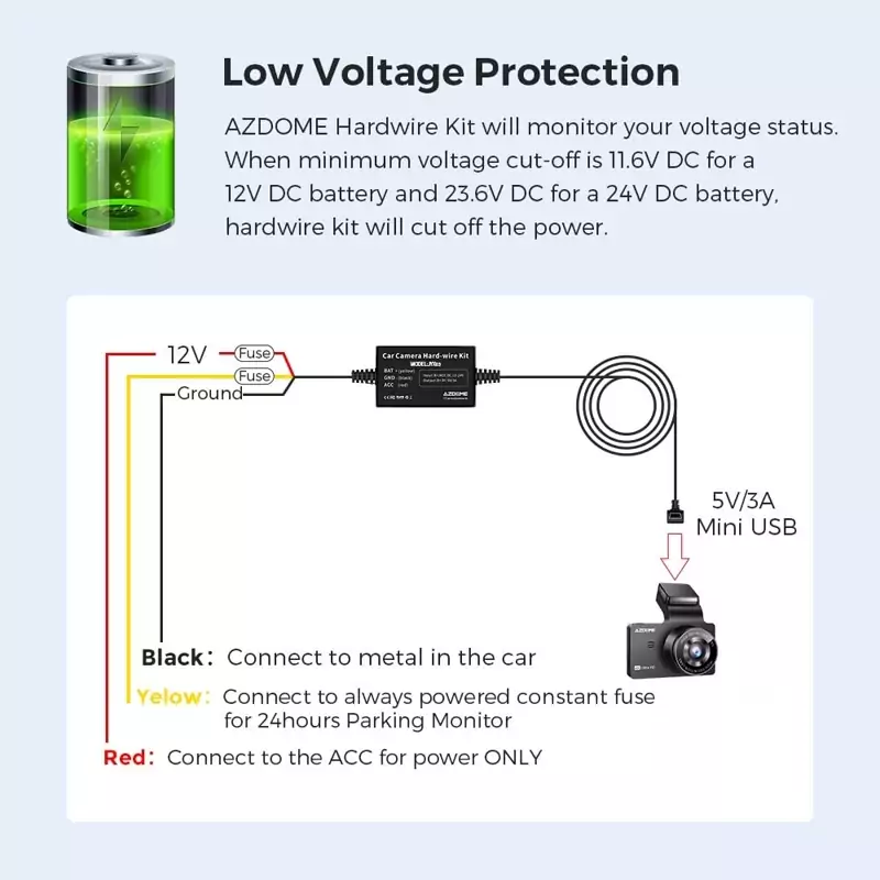 مشخصات کالا مناسب برای خودروی بیشتر خودروها توضیحات بیشتر AZDOME JYX03 Mini-USB 3-Lead Acc Hardwire Kit Hardwire for M63 12/24V to 5V/3A Mini USB DVR کابل آداپتور برق ورودی سازگاری گسترده: 12V-24V، خروجی:5V/3A، پورت Mini USB کیت سیم سخت AZDOME دوربین را مستقیماً به ماشین، کامیون، اتوبوس، خودروهای شاسی بلند یا دکل بزرگ متصل میکند و ولتاژ هر نوع وسیله نقلیهای را که با ولتاژ 12-24 ولت کار میکنند، میپذیرد سیستم حفاظت از تخلیه باتری این کیت سیم سخت با عملکرد محافظت در برابر گرمای بیش از حد، جریان بیش از حد و ولتاژ پایین، می تواند از باتری خودروی شما در زمانی که ولتاژ باتری خودرو به 116 ولت (ورودی 12 ولت) یا 236 ولت (ورودی 24 ولت) کاهش می یابد، محافظت کند باکس برق را قطع می کند که باعث می شود قدرت کافی برای احتراق موتور داشته باشید و به باتری آسیبی نرسد نظارت 24 ساعته باعث می شود مانیتور پارکینگ داشکام شما کار کند! حتی پس از خاموش شدن موتور آن را روشن نگه می دارد، همیشه از ماشین خود محافظت کنید! کیت سیم سخت وسیله نقلیه متصل به باتری خودرو یا برق جعبه فیوز میتواند بدون وقفه برق دوربین داشبورد را به مدت 24 ساعت تامین کند، از دزدیده شدن خودروی شما در پارکینگ جلوگیری کند حتی میتواند وقتی ماشین خاموش است، برق را تامین کند نصب آسان نیازی به اشغال فندک خودرو نیست، فقط کیت سیم سخت خودرو را به باتری خودرو یا درگاه برق جعبه فیوز متصل کنید، سیم را به موقعیت دستگاه هدایت کنید در عرض چند دقیقه، میتوانید نصب را با تخصص کم یا بدون نیاز به اتمام برسانید همچنین، دستورالعملهای دقیق راهنمای کاربر در بسته ارائه شده است نکات: لطفا قبل از استفاده دفترچه راهنمای کاربر را به دقت مطالعه کنید تغییر خودکار حالت پارک کیت Hardwire دارای عملکرد تشخیص ACC است، هنگامی که خودرو روشن و خاموش می شود، سیگنالی را به داشکام ارسال می کند که می تواند به طور خودکار حالت پارک را روشن و خاموش کند کابل زرد به فیوز پیوسته متصل می شود (همیشه برق را تامین می کند، حتی زمانی که احتراق خاموش است)، کابل ACC RED به یک فیوز سوئیچ شده وصل می شود (فقط زمانی که احتراق روشن است، برق را تامین می کند) کابل مشکی به زمین خودرو متصل است گارانتی 24 ماهه این محصول 24 ماه گارانتی و پشتیبانی مادام العمر مشتری را پوشش می دهد، AZDOME طرفداران شما خواهد بود