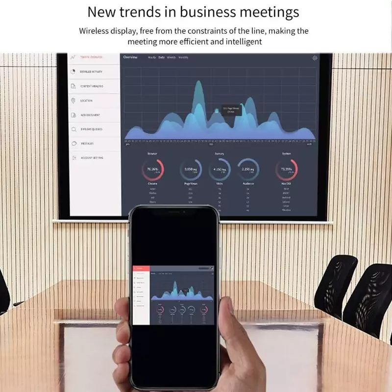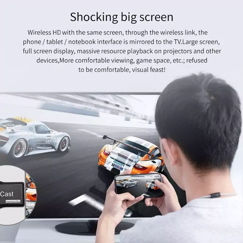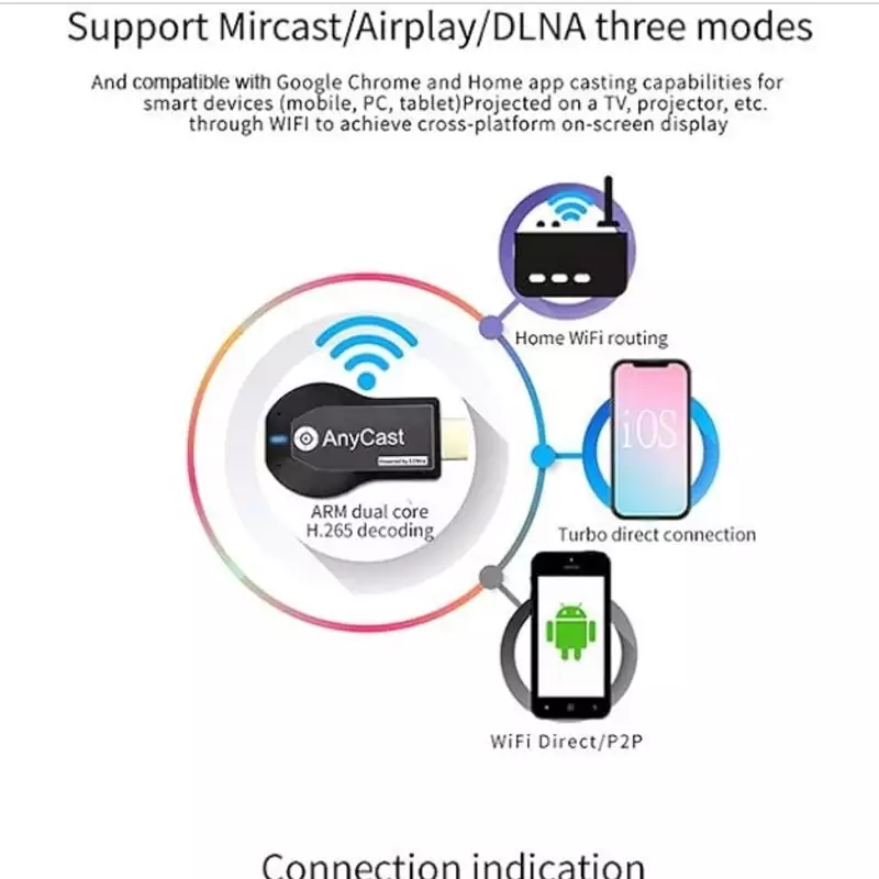 آسان برای استفاده: بدون A یا درایور مورد نیاز است. فقط 3 st برای لذت بردن از رسانه در صفحه بزرگ: Plug-Connect-Mirroring با استفاده از حالت Miracast و Airplay. روی این محصول دکمه ای وجود دارد که می تواند حالت ها را تغییر دهد.